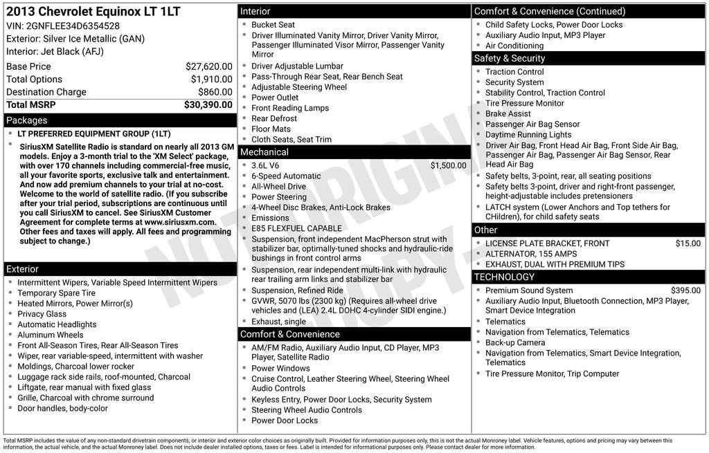 Equipment Group 1LT (6 Speaker Audio System Feature and Manual Climate Control), AWD, 155 Amp Alternator, 17" Aluminum Wheels, 4-Wheel Disc Brakes, 6 Speakers, ABS brakes, Air Conditioning, Alloy wheels, AM/FM radio: SiriusXM, Bluetooth® For Phone, Brake assist, Bumpers: body-color, CD player, Chevrolet MyLink Touch, Compass, Delay-off headlights, Deluxe Front Bucket Seats, Driver door bin, Driver vanity mirror, Dual Exhaust w/Premium Tips, Dual front impact airbags, Dual front side impact airbags, E85 Flexfuel Capable, Electronic Stability Control, Emergency communication system: OnStar Directions & Connections, Exterior Parking Camera Rear, Four wheel independent suspension, Front anti-roll bar, Front Bucket Seats, Front Center Armrest, Front License Plate Bracket, Front reading lights, Fully automatic headlights, Heated door mirrors, Illuminated entry, Low tire pressure warning, Occupant sensing airbag, Outside temperature display, Overhead airbag, Panic alarm, Passenger door bin, Passenger vanity mirror, Pioneer Premium 8-Speaker System, Power door mirrors, Power driver seat, Power steering, Power windows, Premium Cloth Seat Trim, Radio data system, Radio: AM/FM Stereo w/CD/MP3/Touch-Screen Display, Rear anti-roll bar, Rear seat center armrest, Rear window defroster, Rear window wiper, Remote keyless entry, Roof rack: rails only, Security system, SIRIUSXM Satellite Radio, Speed control, Speed-sensing steering, Split folding rear seat, Spoiler, Steering wheel mounted audio controls, Tachometer, Telescoping steering wheel, Tilt steering wheel, Traction control, Trip computer, and Variably intermittent wipers.