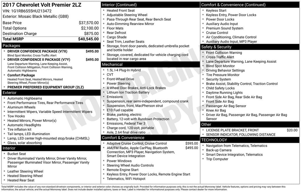 Comfort Package (Heated Driver & Passenger Front Seats, Heated Steering Wheel, and Outside Heated Power-Adjustable Body-Color Mirrors), Driver Confidence II Package (Following Distance Sensor Indicator, Forward Collision Alert, IntelliBeam Automatic High-Beam Headlamps, Lane Keep Assist, and Low-Speed Forward Automatic Braking), Driver Confidence Package (Rear Cross-Traffic Alert Sensor Indicator and Side Blind Zone Alert w/Lane Change Alert), Preferred Equipment Group 2LZ (Bose Premium 8-Speaker Audio System Feature), 1.5L VVT DI DOHC 4-Cylinder Range Extender, 4-Wheel Disc Brakes, 8 Speakers, ABS brakes, Adaptive Cruise Control, Air Conditioning, Alloy wheels, AM/FM radio: SiriusXM, Apple CarPlay, Auto-dimming Rear-View mirror, Automatic temperature control, Brake assist, Bumpers: body-color, Compass, Delay-off headlights, Driver door bin, Driver vanity mirror, Dual front impact airbags, Dual front side impact airbags, Electronic Stability Control, Emergency communication system: OnStar Guidance, Exterior Parking Camera Rear, Forward Automatic Braking, Front anti-roll bar, Front Bucket Seats, Front Center Armrest, Front License Plate Bracket, Front reading lights, Front wheel independent suspension, Fully automatic headlights, Heated door mirrors, Heated front seats, Heated rear seats, Heated steering wheel, Illuminated entry, Knee airbag, Leather-Appointed Seat Trim, Low tire pressure warning, NavTraffic, Occupant sensing airbag, Outside temperature display, Overhead airbag, Overhead console, Panic alarm, Passenger door bin, Passenger vanity mirror, Power door mirrors, Power steering, Power windows, Premium audio system: Chevrolet MyLink, Radio: Chevrolet MyLink AM/FM Stereo, Radio: Chevrolet MyLink AM/FM Stereo w/Navigation, Rear reading lights, Rear seat center armrest, Rear side impact airbag, Rear window defroster, Remote keyless entry, Security system, SiriusXM Satellite Radio, SiriusXM Travel Link, Speed control, Speed-sensing steering, Split folding rear seat, Steering wheel mounted audio controls, Telescoping steering wheel, Tilt steering wheel, Traction control, Trip computer, Variably intermittent wipers, and Wheels: 17" x 7" Split 5-Spoke Aluminum.