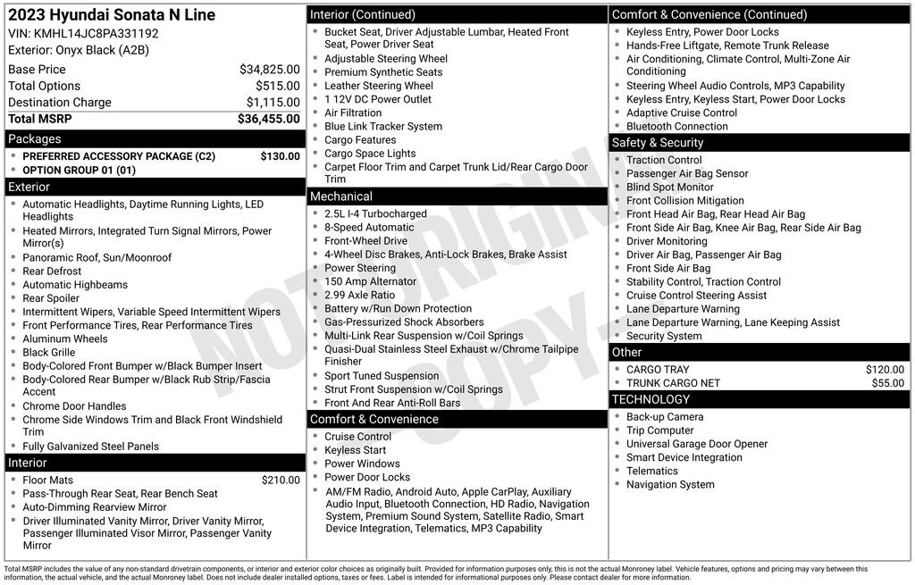 Option Group 01, Preferred Accessory Package (Cargo Block, Cargo Side Bins, and First Aid Kit), Black Leather, 12 Speakers, 4-Wheel Disc Brakes, ABS brakes, Air Conditioning, Alloy wheels, AM/FM radio: SiriusXM, Apple CarPlay & Android Auto, Auto High-beam Headlights, Auto-dimming Rear-View mirror, Automatic temperature control, Brake assist, Bumpers: body-color, Cargo Tray, Carpeted Floor Mats, Delay-off headlights, Driver door bin, Driver vanity mirror, Dual front impact airbags, Dual front side impact airbags, Electronic Stability Control, Emergency communication system: Blue Link Connected Car Service (3-year complimentary subscription), Exterior Parking Camera Rear, Four wheel independent suspension, Front anti-roll bar, Front Bucket Seats, Front Center Armrest, Front dual zone A/C, Front reading lights, Fully automatic headlights, Garage door transmitter: HomeLink, Heated door mirrors, Heated front seats, Heated N Unique Sport Seats, Illuminated entry, Knee airbag, Leather Seating Surfaces, Leather steering wheel, Low tire pressure warning, Navigation System, Occupant sensing airbag, Outside temperature display, Overhead airbag, Overhead console, Panic alarm, Passenger door bin, Passenger vanity mirror, Power door mirrors, Power driver seat, Power moonroof, Power steering, Power windows, Radio data system, Radio: AM/FM/MP3/HD/SiriusXM Display Audio w/Nav, Rear anti-roll bar, Rear seat center armrest, Rear side impact airbag, Rear window defroster, Remote keyless entry, Security system, Speed control, Speed-sensing steering, Speed-Sensitive Wipers, Split folding rear seat, Spoiler, Steering wheel mounted audio controls, Tachometer, Telescoping steering wheel, Tilt steering wheel, Traction control, Trip computer, Trunk Cargo Net, Turn signal indicator mirrors, Variably intermittent wipers, and Wheels: N Unique 19" x 8.0J Aluminum Alloy.